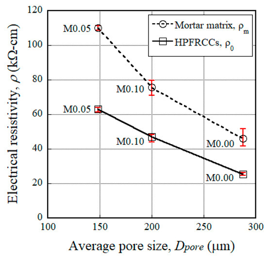 The results of slump flow and slump tests were found to be important, especially for evaluating the uniform distribution of electrical fillers within the mortar mixture, as this gives materials significantly different electrical resistivities. The amount of superplasticizer required to ensure a uniform distribution of steel fibers in the mixture should be modified according to the amount of MGFs. HPFRCCs showed clearly different electromechanical responses according to the amount of MGFs. Among the mortars and HPFRCCs containing MGFs, the electrical resistivity (ρm and ρ0) was the highest for the M0.05 series (containing 5 wt %), as seen in Figure 2. The higher electrical resistivity of the M0.05 series compared to those of the other series (M0.00 and M0.10), despite containing only half of the content of electrically nonconductive MGFs of the M0.10 series, requires further clarification. Monfore [53] and Teomete [54] reported that the electrical resistivity of a cement-based matrix decreased as the pore size increased since the electrical resistivity of the matrix was greatly influenced by the effective ions within the pores. Thus, by using FE-SEM in this study, we also investigated the pore size in relation to the amount of MGFs (see Figure 10 and Table 7). The average pore sizes were measured as 288.0, 148.3, and 200.3 μm for the M0.00, M0.05, and M0.10 series, respectively. The M0.05 series—with the highest electrical resistivity (ρm and ρ0)—was found to have the smallest pore size (see Figure 11). It has been reported that the pore size influences the electrical properties of cement-based materials [55], even though the distribution of electrically conductive or nonconductive fillers in the mixture is critical for their electrical and/or mechanical properties [15,22,27,30].