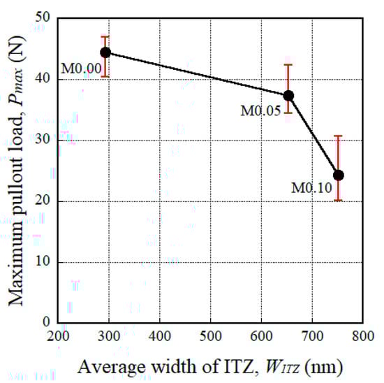 It is well-known that the interfacial bond resistance between a steel fiber and the mortar is strongly dependent upon the properties of the interfacial transition zone (ITZ), including its width, local stiffness, and porosity. Bentur et al. [56] also reported that the ITZ between the fiber and mortar matrix has a significant effect on the interfacial bond strength. Thus, we also measured the width of the ITZ (WITZ) and correlated this with the maximum pullout load (Pmax) corresponding to the amount of MGFs (see Figure 12). As the amount of MGFs increased from 0 to 10 wt %, Pmax decreased from 41.93 to 24.35 N, whereas WITZ increased from 294 to 752 nm. Kong et al. [57] reported that an increased glass fiber content decreased the calcium-silicate-hydrate (C-S-H) gel, leading to a reduced WITZ. Moreover, there is a noticeable difference—especially at the end of the fiber pullout curves—according to the addition of MGFs, as can be seen in Figure 9. The pullout load of the M0.00 series showed a continuous decrease after the peak point and then slightly increased at the end of the curve. However, for both the M0.05 and M0.10 series, the pullout load significantly increased again at the end of the curve. As seen in Figure 13, both of the M0.05 and M0.10 series contained many more cementitious material particles attached to the surfaces of steel fibers after fiber pullout than did the M0.00 series. Moreover, the M0.05 series also showed many more such cementitious material particles than the M0.10 series. During fiber pullout, interfacial failure occurred at the interface between the fiber and the matrix in the M0.00 series; however, in both the M0.05 and M0.10 series, failure would have occurred at the matrix rather than at the interface. The cementitious material particles attached to the surfaces of steel fibers accumulated at the interfacial tunnel during fiber pullout; consequently, the pullout load significantly increased at the end of the curves. Thus, the M0.05 series produced the highest τeq, which is correlated with the direct tensile response of HPFRCCs. Furthermore, as can be seen in Figure 1, unlike ordinary SFRCs, in which the electrical resistivity showed a slight increase after post-cracking due to the absence of further matrix cracking, the electrical resistivity of HPFRCCs slightly declined even after post-cracking because the cementitious materials were gradually removed from the surface of the steel fibers owing to failure at the matrix rather than at the interface.