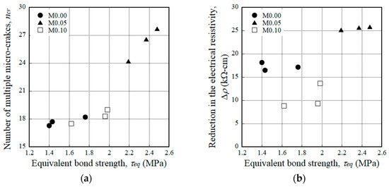 Effects of the equivalent bond strength on (a) the number of multiple micro-cracks and (b) the reduction in the electrical resistivity.