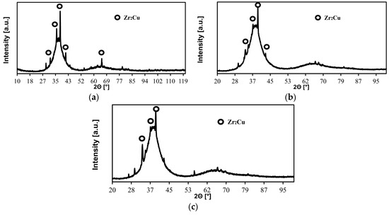 The test results concerning the phase composition of the weld surfaces are also presented in Figure 3b,c). The diffraction tests of the Zr55Cu30Ni5Al10 BMG specimen exposed to the laser beam having a power of 700 W and 1000 W revealed the presence of amorphous phase-related broad, diffuse spectra as well as the presence of Zr2Cu crystalline phase-related low diffraction reflections.