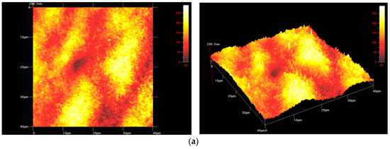 Surface topography in the area of the (a) parent material, (b) Zr-Cu-Ni-Al laser weld—parameters no. 1 and (c) heat affected zone—parameters no. 2 (2D image, 3D image; Atomic Force Microscope (AFM)).