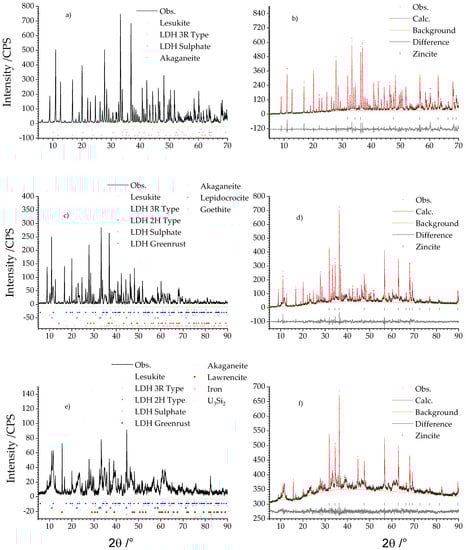 Lesukite was quantitatively the major phase and mounted up to 95.37 ± 0.31 wt %. Chloride and sulphate type LDH exhibit accessory amounts of 1.43 ± 0.26 and 0.25 ± 0.08 wt %. A further accessory mineral is akageneite with 2.05 ± 0.15 wt %. The amorphous content was practically not existent due to the determined uncertainties.