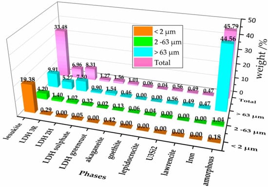 Figure 2 shows an overview of the quantities being normalized for each fraction to the total amount of all obtained secondary phases. From the magenta colored columns in the last row, representing the total of all fractions could be seen that the amorphous part with more than 45 wt % is the most abundant phase. Second and third ranked in quantity were lesukite and various LDH types. All other phases were just present as accessories. It is expected that the amorphous part contains the uranium because—with exception of the residues of U3Si2—no further crystalline uranium phases were observed. The observed content of uranium and silicon (as U3Si2) was very low compared to the originally supplied quantities. With respect to the findings of [39] and taking into account that uranium was not found in the liquid part of the suspension of brine 2 it could be assumed that uranium is thus quantitatively constituents of the amorphous phases. This result constitutes an important finding as the analogue experiments of Curtius et al. [39] with irradiated U3Si2-Al showed that not only uranium but also americium, plutonium, and europium, as well were mostly immobilized in the solid phase. Therefore, possible implications for the source term must be evaluated whether the radionuclides in the SNF are also part of the amorphous phases, because the solubility is a critical parameter for their immobilization.