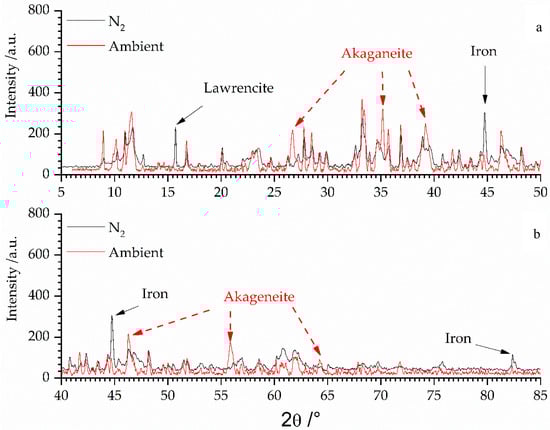 The black diffractogram, being recorded in N2 atmosphere, shows the fraction >63 µm (cf. Figure 1 and Figure 3). The peak positions of lawrencite and iron have been marked with black arrows. These reflections of the Fe0/2+ species vanished and new peaks (red arrows) of akaganeite (Fe3+) could be observed, when the sample was subjected to air for several weeks.