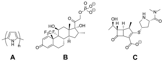 The chemical structures of the substances studied herein: (A) Polypyrrole (PPY); (B) dexamethasone phosphate (DMP); (C) meropenem (MER).