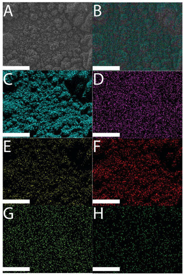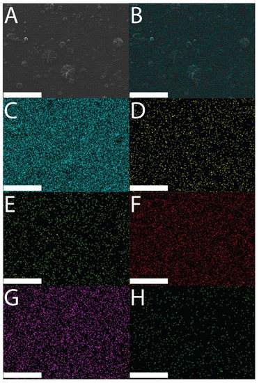 SEM and EDX images of an MER-doped PPY film: (A) SEM image of an MER-doped PPY film; (B) EDX layered image from an MER-doped PPY film; (C) Kα emission of C; (D) Kα emission of P; (E) Kα emission of F; (F) Kα emission of O; (G) Kα emission of N; (H) Kα emission of Si. Scale bars represent 100 µm.
