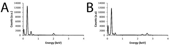 The EDX maps in Figure 2 and Figure 3 demonstrate the elemental composition of the films to be homogeneous over the surface of the films. Analysis of the EDX data for DMP-doped or MER-doped films (Figure 4A,B, respectively) showed elemental signals characteristic of carbon (Kα at 0.277 keV) and nitrogen (Kα at 0.392 keV) found on polypyrrole. For the DMP-doped films, there were peaks at 0.677 keV, 0.525 keV, and 2.014 keV, characteristic of the Kα of F, O, and P, respectively (Figure 4A). For the MER-doped films, there were peaks at 0.525 keV, 2.308 keV, and 2.622 keV, characteristic of the Kα of O, S, and Cl, respectively (indicative of the hydrochloride salt of MER, Figure 4B).