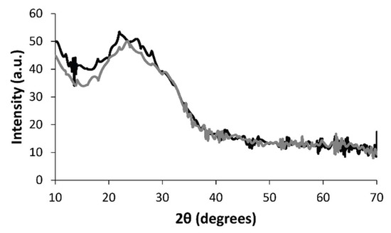 X-ray diffraction (XRD) data. (Black line) DMP-doped PPY film. (Gray line) MER-doped PPY film.