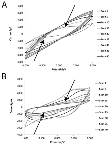 Cyclic voltammetry (CV) data of the films in phosphate-buffered saline (PBS; pH = 7.4) at a scan rate of 50 mV·s−1: (A) DMP-doped PPY film; (B) MER-doped PPY film.