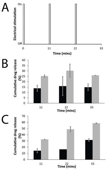 Electrochemically enhanced delivery of drugs from films in PBS (pH = 7.4) as determined by UV spectroscopy: (A) Electrical stimulation paradigm: three cycles of 30 s on, 10.5 min off; (B) cumulative release of DMP from DMP-doped PPY films, passive release (black bars), electrically stimulated release (gray bars); (C) cumulative release of MER from MER-doped PPY films, passive release (black bars), electrically stimulated release (gray bars).