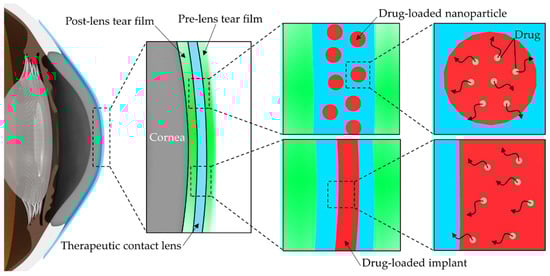 Schematic of drug release onto the ocular surface from drug-eluting therapeutic contact lens. Typical polymeric vehicles for therapeutic contact lenses include drug-loaded polymeric nanoparticles and drug-loaded polymeric implants inside contact lenses.