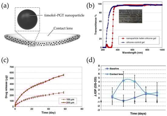 (a) Schematic of a therapeutic contact lens embedded with timolol–PGT nanoparticles; (b) Transmittance spectra of silicone control and PGT nanoparticle-embedded silicone hydrogel. The inset shows a photograph of the PGT nanoparticle-embedded silicone hydrogel; (c) Cumulative drug release profile from timolol–PGT nanoparticle-loaded hydrogels with 100 and 200 μm thickness, respectively; (d) Pharmacodynamic profile of timolol–PGT nanoparticle-loaded contact lenses in beagle dogs, which was expressed as the difference between the intraocular pressure (IOP) of the untreated (OS) and the treated eye (OD). The IOP-lowering effect due to timolol–PGT nanoparticle-loaded contact lenses was seen on day 2 and day 3. Reprinted with permission from [28].