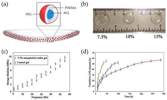 Unlike the case for hydrophilic drugs such as timolol, hydrophobic drugs are hard to load properly into contact lenses which have a water containing property. Loteprednol etabonate (LPE), an approved drug by the FDA in 1998, is an ester corticosteroid with high anti-inflammatory potency for the treatment of allergic conjunctivitis, uveitis, post-cataract surgical inflammation, etc., and has a low solubility in water (0.5 μg/mL) [40,41,42]. Polycaprolactone (PCL) is a hydrophobic biomaterial and FDA-approved bioresorbable polymer without toxic byproducts [43,44]. Nasr et al. produced hydroxyethylmethacrylate (HEMA)/N-vinylpyrrolidone (NVP) copolymer-based contact lenses embedding LPE-loaded PCL-based nanoparticles (Figure 3a) [29]. The PCL-based nanoparticles were prepared by surfactant-free miniemulsion polymerization (SFEP) and the resulting nanoparticles were composed of a hydrophilic outer shell (PEG; polyethylene glycol), a hydrophobic inner shell (poly-HEMA), and a hydrophobic core (PCL). Then poly(HEMA-co-NVP)-based hydrogels loaded with drug-loaded nanoparticles were prepared by free radical photopolymerization. The nanoparticle-loaded hydrogels exhibited high transmittance in the visible range at different nanoparticle loadings (Figure 3b) and comparable mechanical properties to typical commercial lenses (Figure 3c). These therapeutic contact lenses embedded with LPE-loaded nanoparticles exhibited an extended and sustained LPE release for about 12 days in in vitro experiments compared to both drug-loaded hydrogel and drug-loaded nanoparticles (Figure 3d). Because of the PCL-based nanoparticles as a vehicle, a better distribution of the drugs in poly-HEMA-based contact lenses was possible and therefore, the release time could be improved despite the use of hydrophobic drugs.