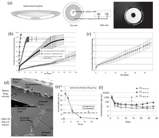 Ciolino et al. reported the efficacy of therapeutic contact lenses containing PLGA films impregnated with several types of drugs, including ciprofloxacin, econazole, and latanoprost [63,64,65]. Ciprofloxacin, a second-generation fluoroquinolone, is one of the most commonly used broad-spectrum antibiotics and it exhibits antibacterial effects by inhibiting gyrase and topoisomerase IV, essential enzymes for bacterial cell growth and division [69,70,71]. However, it showed precipitate formation on the surface of contact lenses soaked in drug solution due to its poor solubility in water [72,73,74,75,76]. The ciprofloxacin-loaded PLGA films were prepared by a solvent casting method and these were punched out as a 14-mm outer diameter ring with a 5-mm central aperture for high central transmittance. Then these films were incorporated inside poly-HEMA contact lens, such as a sandwich (Figure 4a) [63]. The thickness of ciprofloxacin-loaded PLGA films and overall thickness of contact lenses were quite thick, about 225 μm and 450 μm, respectively. The release profiles with fluorescein as a preliminary study showed continuous and sustained release of fluorescein from a poly-HEMA-contact lens embedded with fluorescein-PLGA films for at least 100 days (Figure 4b). In vitro ciprofloxacin release profiles showed a similar sustained release with zero-order kinetics over 4 weeks after small initial burst release (Figure 4c). Additionally, the drug release could be manipulated by either adjusting the ratio of drug to PLGA film or changing PLGA’s molecular weight.