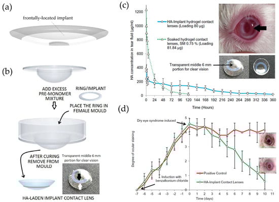 It is possible to make implants for drug release with the same polymeric material used in contact lenses [62,66]. Hyaluronic acid (HA) is a very hydrophilic natural polymer consisting of repeating disaccharide units of N-acetyl-d-glucosamine and d-glucuronic acid [84,85,86]. It stimulates corneal epithelial proliferation and migration and has been used for treatment of dry eye disease [87,88,89]. Even though HA exhibited a relatively prolonged ocular surface residence time compared to other artificial tears [90], extended residence time is needed for pathologic conditions of the ocular surface such as a severe form of dry eye disease and Sjögren syndrome. Maulvi et al. designed a frontally-located HA-loaded poly-HEMA implant onto the poly-HEMA lens matrix (Figure 5a) [66]. The HA-loaded poly-HEMA implant was first synthesized by mixing HA with the HEMA/MAA monomer mixture and subsequently photo-polymerized. After placing the prepared implant in a female mold, excess pre-monomer mixture was added, and UV polymerization was done with placing the male mold in position. As a result, the prepared implant was incorporated into poly-HEMA contact lenses at the front surficial region (Figure 5b). Poly-HEMA is a hydrophilic hydrogel with high water content and has been widely used in biomedical applications, including contact lenses and ophthalmic drug delivery systems, due to its safety and excellent biocompatibility [91,92]. MAA is a hydrophilic co-monomer which can be polymerized with HEMA and is used to enhance water content because of the properties of being ionized above pH 5.5 and imparting a negative charge to hydrogels [93,94,95]. In vivo HA release experiments using rabbits exhibited prolonged HA release over 15 days with about an 80 μm-thick HA-loaded implant and 100 μm-thick contact lenses, compared to release within 120 h for HA-soaked contact lenses (Figure 5c). Moreover, in vivo efficacy studies in benzalkonium chloride-induced dry eye disease rabbits by evaluating ocular surface damage according to the degree of corneal fluorescein staining showed the enhanced healing effects of contact lenses with HA-loaded implants (Figure 5d) [66]. Alvarez-Lorenzo et al. also reported that incorporation of MAA into poly-HEMA hydrogels improved the timolol-loading capacity [94], while Weeks et al. reported that incorporation of higher concentrations of MAA reduced the amounts of HA loading in poly-HEMA hydrogels [95], which is probably due to the negatively charged HA with a pKa 3~4 in physiological conditions [96,97]. Therefore, it may be necessary to adjust each component in contact lenses to optimize HA loading.