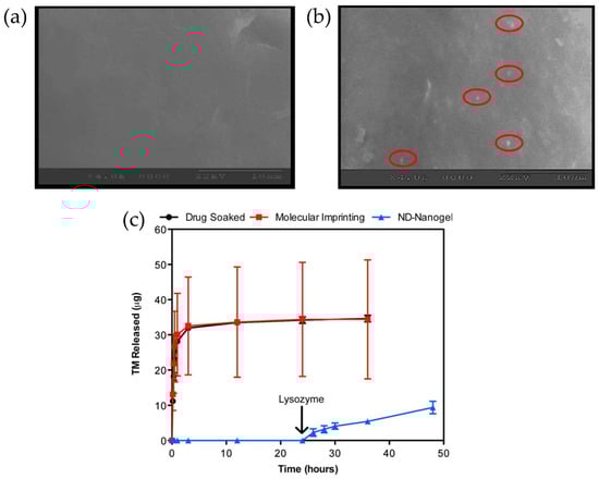 SEM images of (a) the surface of pure poly-HEMA contact lens; (b) the surface of nanoparticle-laden poly-HEMA contact lens with visible nanoparticles (red circle). Reprinted with permission from [30]; (c) Timolol-eluting profiles from drug-soaked (black line), molecularly imprinted (red line) and nanodiamond nanogel-embedded contact lenses (blue line), showing lysozyme-triggered drug release. Reprinted with permission from [125].