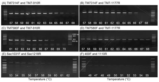 Because the optimal annealing temperature is dependent on the primers and DNA samples, the annealing temperature for four Saccharibacteria-specific primer sets was determined using DNA extracted from activated sludge and temperature-gradient PCR from 57 to 70 °C. No DNA bands were observed in gel electrophoresis from PCR amplification with the other two primer sets (Sac1031F and Sac1218R; 400F and 1110R) at the proposed annealing temperature (60 °C for both primer sets; Figure 1E,F and Figure S2). In this study, the optimal annealing temperature was determined based on the decreasing amplicon band intensity on agarose gel (Figure 1), and decreasing concentration of PCR products with increasing annealing temperature (Figure S2). The optimal annealing temperatures of the four primer sets are listed in Table 2. These annealing temperatures were higher than the original primer melting temperatures (Tm) [10,16].