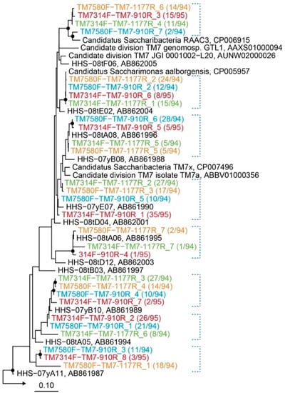 Maximum-likelihood phylogenetic tree of Saccharibacteria-related operational taxonomic units (OTUs) obtained from activated sludge. Colored OTUs represent OTUs obtained from different primer sets. Numbers in parentheses indicate the frequency of identical clones analyzed from each library. The scale bar represents the number of nucleotide changes on each position. Filled circles at the nodes represent bootstrap support of >90% obtained from 1000 resamplings. Blue dotted lines indicate identical clones detected with different primer sets. Five Thermotoga sequences were used as an outgroup. Black sequences labelled as HHS indicate OTUs obtained from a previous study [12]; other black sequences are reference sequences from the database.