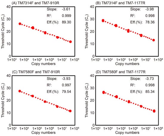Standard curves of Saccharibacteria qPCR for the measurement of activated sludge samples using 10-fold serial dilutions of plasmid DNA carrying Saccharibacteria 16S rRNA genes and the four primer sets: TM7314F and TM7-910R (A); TM7314F and TM7-1177R (B); TM7580F and TM7-910R (C); and TM7580F and TM7-1177R (D). The slope, coefficient of determination (R2), and amplification efficiency are also shown in the figures.