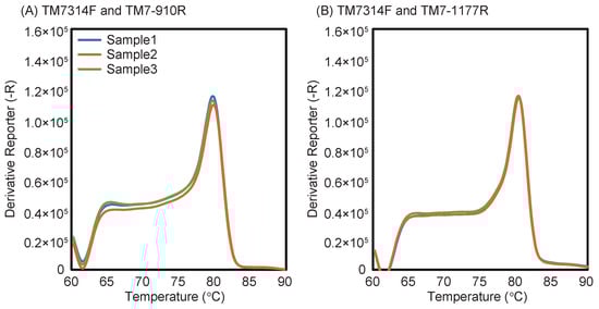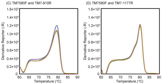 Standard curves for the four primer sets were constructed from a series of 10-fold dilutions of plasmid DNA carrying partial 16S rRNA gene of Saccharibacteria, ranging from 1.17 × 103 to 6.15 × 107 copy numbers (Figure 3). The standard curves of primer sets with TM7-910R showed higher amplification efficiencies (Figure 3A,C), whereas those with TM7-1177R showed <90% amplification efficiencies (Figure 3B,D). The melting curves using DNA extracted from activated sludge for the four primer sets indicated the presence of specific amplification products at around 80 °C (Figure 4). The standard curves and melting curves for the four primer sets using plasmid DNA carrying Saccharibacteria 16S rRNA genes are shown in Figures S4 and S5.