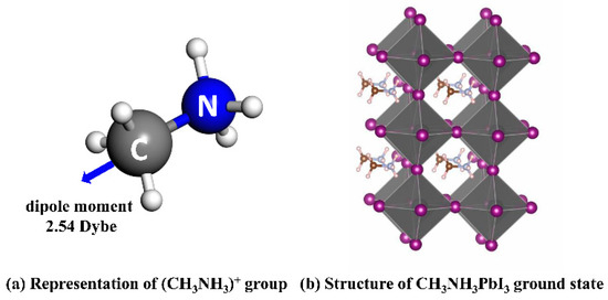 Structure model of (a) (CH3NH3)+ group (the arrow represents the direction of electric dipole moment in the group), and (b) CH3NH3PbI3 ground state (the PbI6 octahedral is rendered).