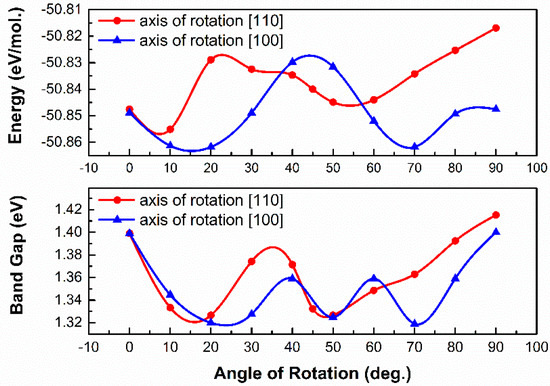 Furthermore, the variation of bandgap with the group orientation is evaluated (As seen in Figure 2b). According to the results, the fluctuation of bandgap caused by the asymmetry of electronic distribution and the electric dipole moment in (CH3NH3)+ group is 0.1 eV. It is interesting that the lowest total energy and the minimum bandgap appear at the same point, namely at the position of ±20° when rotating along [100] direction. Since that the bandgap shrinks with the intensity of electronic hybridization, it is reasonable to deduce that the system has the lowest energy when the electronic bonding is the strongest.