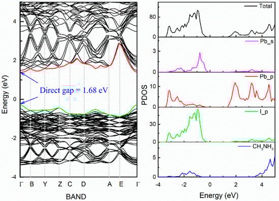 The point with the lowest energy on the energy–orientation curve corresponds to the ground state of CH3NH3PbI3 (Figure 1b). After geometry relaxations, the band structure of ground state in CH3NH3PbI3, drawn between high symmetry points of the Brillouin zone, has been illustrated in Figure 3. CH3NH3PbI3 is found to have a direct bandgap of 1.68 eV at Γ. This result is well consistent with the reported experimental values [41,42,43]. The partial electronic densities of state (PDOS) indicates that the upper valence bands (VB) mainly consist of I-5p orbital with weak hybridization to Pb-5s state, and the lower conduction bands (CB) are dominated by Pb-6p orbital. While the (CH3NH3)+ group has little contribution to the band edge states. The character of band structure in this work is consistent with recent investigations [44,45,46]. As a result, the band gap of CH3NH3PbI3 will be strongly related to the structure of (PbI6) inorganic framework. We can thus infer that the influence of (CH3NH3)+ group on the electronic structure belongs to Jahn–Teller effect, that is, the change of electronic structure of the system originates from the distortion of (PbI6) octahedral caused by the size and orientation of (CH3NH3)+group, rather than from the direct participation in the electronic structure of (CH3NH3)+. According to our “anion group model” [47], this feature of the electronic structure helps to improve the stability through the element substitution without losing light response and conversion capability.