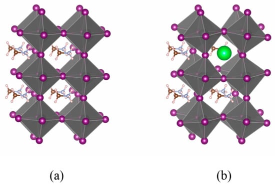People attempted to control the composition and proportion of dopants by an alloying method to improve the performance of CH3NH3PbI3-based perovskites. For halogen doping, it has been found that mixing Cl/Br in CH3NH3PbI3 can not only realize the continuous tuning of solar absorption, but also improve the carrier mobility and reduce carrier recombination rates [12,13]. However, due to the thermodynamic instability of the solutions, halogen impurities may cause the segregation of CH3NH3PbI3 into iodide-rich minority and bromide-enriched majority domains under light exposure [14].