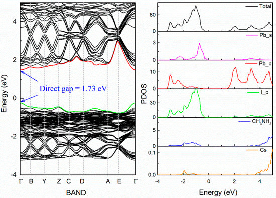 As the incorporation of Cs will induce a 2.75 Debye net electric dipole moment, we introduce an electric dipole correction term in the electronic structure calculation of Cs0.125(CH3NH3)0.875PbI3. In Figure 5, energy band diagram clearly shows that the bandgap of 12.5 at.% Cs-doped CH3NH3PbI3 is 1.73 eV, being ~3% wider than that of the pure CH3NH3PbI3. It can be seen that the Cs dopant does not introduce new states at the band edges. This result is consistent with the “anoin group model” in that A-site alkali metal or alkaline earth metal cation in perovskites can hardly influence the electronic state near the Fermi level [47], and this is why the alkali metal doping does not cause the deterioration of photovoltaic performance of CH3NH3PbI3. As a result, A-site participation of alkali metal or alkaline earth metal is a promising way to stabilize the hybrid perovskite photovoltaic materials with reliable photovoltaic properties.