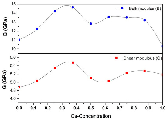 In Figure 6, our calculations show that the bulk modulus (B) of pure CH3NH3PbI3 is 11.0 GPa, and The shear modulus (G) is 4.9 GPa, which is comparable to the reported experimental value [55,56]. When the Cs-concentration is below 37.5 at.%, both bulk modulus and shear modulus keep going up and the top value of them is higher than that of pure CH3NH3PbI3 by 3.5 GPa and 0.6 GPa, respectively. When the Cs-concentration increases further, the corresponding elastic modulus decreases with fluctuation. Our calculations suggest that the Cs-concentration should be controlled in the range of 20~35 at.% if we want to achieve the optimal equilibrium mechanical performance. Due to the limitation of solid solubility, the actual Cs-concentration may be lower than this range. However, the elastic moduli still are higher than that of the pure substance, as shown in Figure 6.