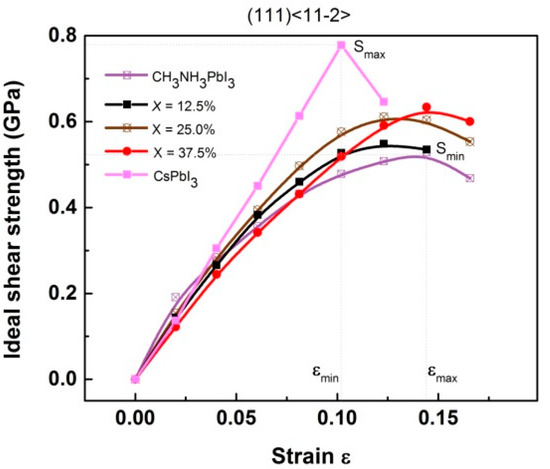 The high value of elastic moduli near the equilibrium does not guarantee the high strength. The fracture feature of Cs-doped (CH3NH3)PbI3 should be basically understood from the ideal shear strength obtained far from the equilibrium. The ideal shear stress–strain curves of (CH3NH3)PbI3 solutions in the (111)<11-2> typical slip system are shown in Figure 7.