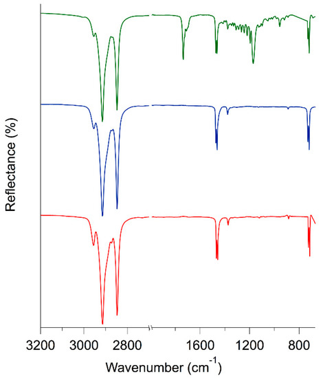 FTIR-ATR spectra of three selected waxes: beeswax (green), paraffin (blue) and ceresin (red).