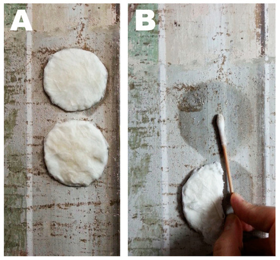 Wax removal tests performed in the Santa Croce Basilica, Florence, Italy. The wax stains appear as brownish concretions, which randomly cover the fresco surface. (A) Microemulsion-loaded compresses during the 2.5 h application. (B) Mechanical removal of the swollen and softened wax deposits by means of a humid cotton swab. Wax removal is evidenced by the brownish staining of the cotton swab tip.