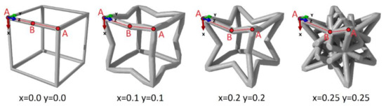 - Favre, J.; Lohmuller, P.; Piotrowski, B.; Kenzari, S.; Laheurte, P.; Meraghni, F. A continuous crystallographic approach to generate cubic lattices and its effect on relative stiffness of architectured materials. Addit. Manuf. 2018, 21, 359–368. [Google Scholar] [CrossRef]