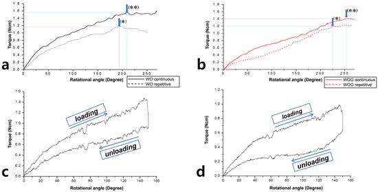 Repetitive loading movements significantly decreased the distortion angle and torsional load in WO and WOG instruments when compared to continuous movement (p < 0.05) (Figure 2a,b). A plot of single continuous rotation to 150-degrees and return showed an elastic response by the absence of plastic deformation (Figure 2c,d).