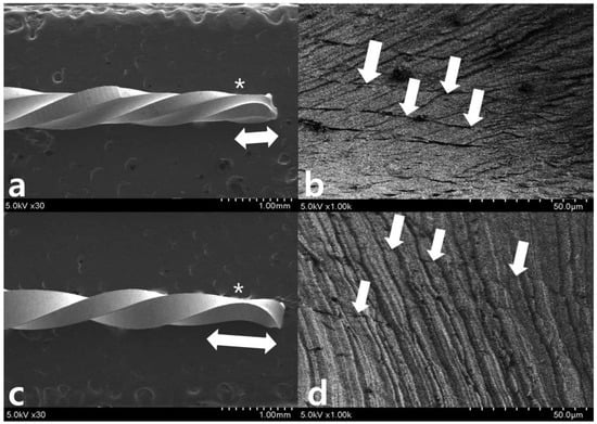 Scanning electron microscopy observation after 270-degree repetitive loading for (a,b) WO and (c,d) WOG (* indicates the restricted area of 3 mm level). SEM evaluation of the lateral aspects shows longitudinal micro-cracks (white arrows in (b,d)) running along the long axis of the file shaft around 3 mm from tip (*). While (a,b) WO shows catastrophic change like a fault after an earthquake, WOG shows distorted machining grooves (dotted lines in (d)) and a few longitudinal micro-cracks (white arrows in (d)).