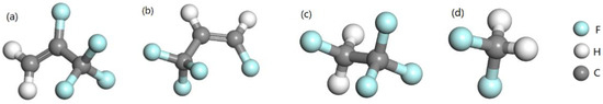 Atomic configurations of R1234yf (a); R1234ze (b); R134a (c) and R32 (d).