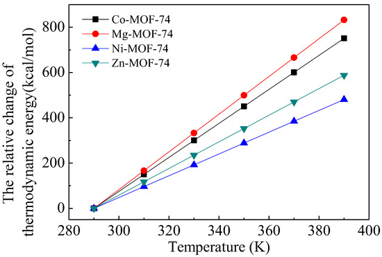 Our previous work [29] indicated that the present method is an efficient approach to obtain the thermodynamic parameters of MOFs. The changes of the thermodynamic energies of M-MOF-74 structures at different temperatures relative to that at the reference temperature of 293 K are plotted in Figure 4. The thermodynamic energy of M-MOF-74 increases linearly with temperature. The increment of thermodynamic energy per unit temperature is the heat capacity of MOFs, Cp, i.e., ρCp-Co-MOF-74 = 3.34 (J/cm3·K), ρCp-Mg-MOF-74 = 3.74 (J/cm3·K), ρCp-Ni-MOF-74 = 2.14 (J/cm3·K), ρCp-Zn-MOF-74 = 2.62 (J/cm3·K). These values are larger than ρCp-MOF-5 = 1.24 (J/cm3·K), which was calculated in our previous work [29]. The difference of heat capacities between MOF-74 and other MOFs was expected to be a result of the difference in their structures and components [3,30].