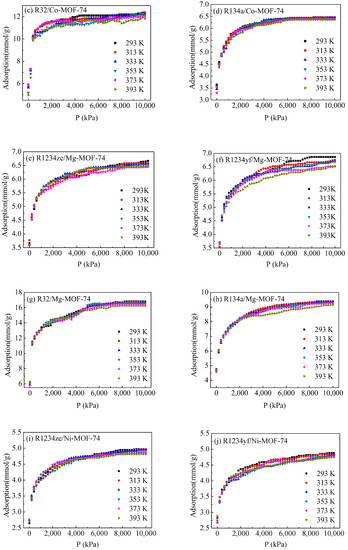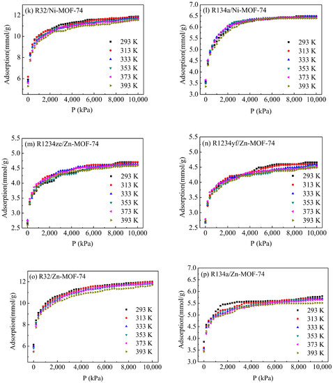 Adsorption isotherms of refrigerants in M-MOF-74 at different temperatures. (a) R1234ze/Co-MOF-74; (b) R1234yf/Co-MOF-74; (c) R32/Co-MOF-74; (d) R134a/Co-MOF-74; (e) R1234ze/Mg-MOF-74; (f) R1234yf/Mg-MOF-74; (g) R32/Mg-MOF-74; (h) R134a/Mg-MOF-74; (i) R1234ze/Ni-MOF-74; (j) R1234yf/Ni-MOF-74; (k) R32/Ni-MOF-74; (l) R134a/Ni-MOF-74; (m) R1234ze/Zn-MOF-74; (n) R1234yf/Zn-MOF-74; (o) R32/Zn-MOF-74; (p) R134a/Zn-MOF-74.