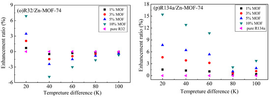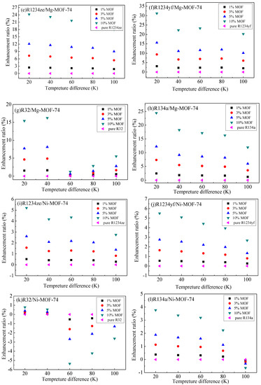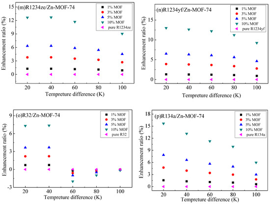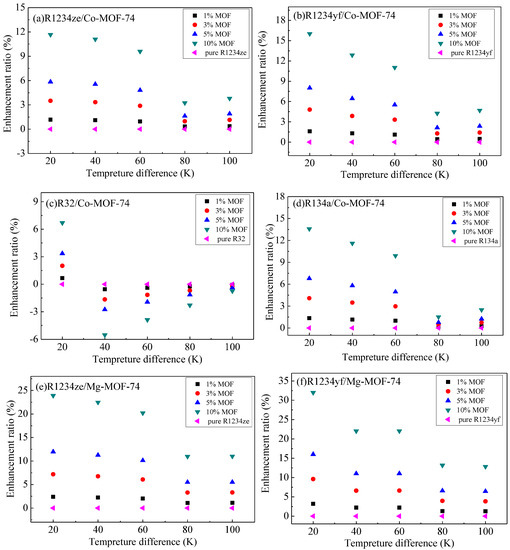 As previously mentioned, the thermal energy storage in MOHCs can be calculated according to Equation (1) or Equation (2). The relationships between thermal energy storage and temperature difference (the temperature of the cold source is 293 K) of the adsorbates (R1234yf, R1234ze, R134a, R32)/MOF-74 mixture at 3500 and 5000 kPa are shown in Figure 6 and Figure 7, respectively. The thermal energy storage capacity of adsorbates (R1234yf, R1234ze, R134a, R32) increased with the mass ratio of MOF-74 nanoparticles in the working fluid. The percentage enhancement of the thermal energy was calculated as [ΔhMOHCs(ΔT) − ΔhFluid(ΔT)]/ΔhFluid(ΔT), where ΔT is the temperature difference relative to the reference temperature of 293 K.