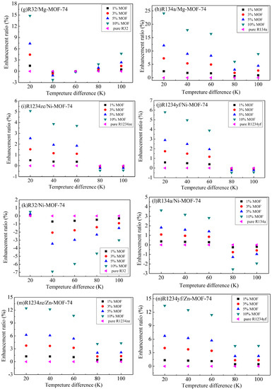 In the M-MOF-74 (M = Co, Mg, Ni) structures, the energy storage enhancement ratio of R1234yf was higher than that of the other three adsorbates. However, in Zn-MOF-74, R134a achieved the highest energy storage enhancement ratio among the four refrigerants considered. The energy storage enhancement ratio of R32 in Zn-MOF-74 was higher than that of the other three M-MOF-74 (M = Co, Mg, Ni) structures, while the energy storage enhancement ratios of R1234yf, R1234ze and R134a in Mg-MOF-74 were higher than those of the other three M-MOF-74 (M = Co, Ni, Zn). It is worth noting that the energy storage enhancement ratio at 5000 kPa is higher than that of 3500 kPa. However, the negative enhancement of thermal energy storage properties is found in a certain temperature range in Figure 6c,g,i,j,k,l,o and Figure 7c,k,l,o. This is because the enthalpy difference of the refrigerant was larger than the sum of the thermodynamic energy change of M-MOF-74 and desorption heat at the corresponding temperature range.