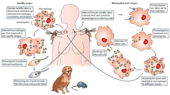 Leishmaniasis has traditionally been classified into three clinical forms, which are: visceral (VL), cutaneous (CL), and mucocutaneous leishmaniasis (MCL). These differ in immunopathology, degree of morbidity and mortality [4]. As shown in Figure 1, all types of leishmaniasis start with the bite of infected female sandflies, which inject metacyclic promastigotes into the skin of the vertebrate host. These promastigotes penetrate into the macrophages, where they transform into replicating amastigotes. The infected macrophages are taken up by sandflies, where the parasites mature into the infective metacyclic promastigote form [5].