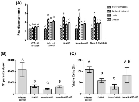 Distribution of the paw diameter (mm) of the mice according to duration of treatment (A), number of parasites per paw (B), and percentage of viable cells (C). Without infection = negative control group; Leishmania = infected animals treated with% PBS; D-AMB = infected animals treated with free D-AMB; Nano-D-AMB = infected animals treated with Nano-D-AMB; Nano-D-AMB-MG = infected animals treated with Nano-D-AMB-MG and AC magnetic field to produce magnetohyperthermia. Different letters indicate significant differences (p < 0.05) detected by the Tukey post hoc test, where comparisons were made between the treatment groups (A,B) and also within the groups: before infection, before treatment, 24 h and 10 days (A). Bar graphs were expressed as standard deviation (from [68]).