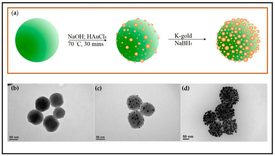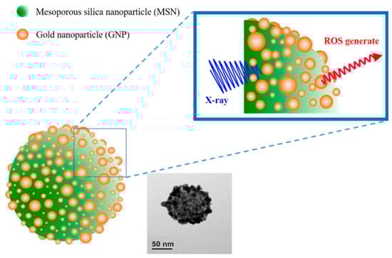 30]. MSNs were selected as the template for gold deposition due to several advantages, including their ease of functionalization, controllable size, and good biocompatibility. Prior to the incorporation of gold on the MSNs surface, functionalization with APTES was performed to obtain a NH