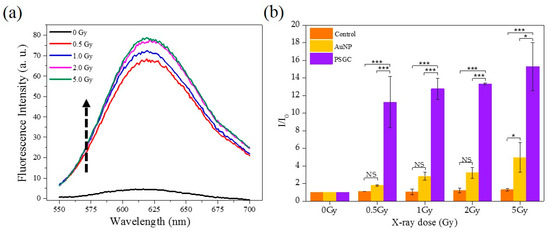 Figure 3a shows an increasing course of DHE fluorescence with the various X-ray irradiation dosages for PSGCs. From the fluorescence emission spectra, there was a significant increase of the fluorescence intensity with respect to the intensity of the irradiation, although a direct proportional relationship was not observed between the dosage and the ROS produced. Rather, the maximum fluorescence was noticed to have peak between 2 and 5 Gy, and this strongly suggested that the full potential of ROS production for these pollen-like structure could have been attained at dosages as low as 2 Gy. The comparison of DHE increment by water, AuNPs, and PSGCs were subsequently quantified and are shown in