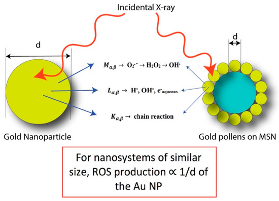 32]. In brief, the core mesoporous silica was first produced via the conventional Stöber process and terminated with (3-aminopropyl) triethoxysilane (APTES). The surface amines were then passivated with a rich layer of gold nanoparticles via electrostatic interaction and subsequently aged to form a rich pollen-like coverage on the surface of the mesoporous silica core. In order to systematically catalogue the characteristics of these gold nanoparticles, we decided to solely focus on the surface attributes of these gold pollen structures—namely, on the ROS production under the irradiation of a low dosage X-ray. These produced ROS levels were subsequently corroborated with preliminary cell-damage studies to better understand how these systems may work in tandem for subsequent cancer therapeutic discourse.