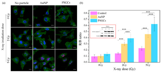 Figure 5b. As compared to untreated cells and AuNP-treated cells, the strongest signal of γ-H2AX was detected in PSGC-treated cells with irradiation. In addition, caspase 3 protein expression for PSGC-treated cells with irradiation was also demonstrated. β-actin protein expression was used as the loading control to normalize the possible errors from the whole process of immunoblotting. The inset in 5b shows a high caspase 3 protein expression level at 4 h after X-ray irradiation at 1, 2, and 5 Gy. The results imply that cells were damaged and had undergone the apoptosis process at this time point, even with a low dosage of X-ray irradiation. Taken together, the in vitro cell study findings were highly correlated with the results from the DHE assay, further confirming the potential of PSGCs in X-ray-induced PDT. Although we noticed that while ROS production was found to have no statistical significance between 2 Gy and 5 Gy, the cellular data seems to suggest that 5 Gy was more efficient in terms of γ-H2AX analysis. This result should be taken into consideration, suggesting that X-ray irradiation alone may induce minor cellular DNA damage. Thus, at close scrutiny of the untreated control samples, we noticed that there was only a slight augmentation of the R/B ratio with respect to the X-ray dosage increment. While the increase of γ-H2AX levels in this study were not found to be statistically significant in all untreated controls for the various X-ray dosages, the marginal increment should be factored for PSGCs, contributing slightly to the higher levels as observed for the PSGCs. Nonetheless, the lack of an appreciable ROS level for the untreated control with respect to the X-ray dosage is highly encouraging and this strongly reinforces the notion of that the novel PSGC system described here may have high clinical practicality.