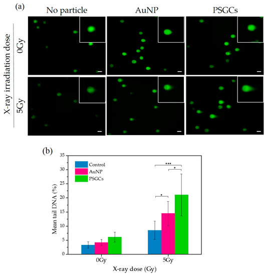 MD-MBA-231 cells were treated with AuNPs and PSGCs at a concentration of 100 μg/mL in serum-free RPMI-1640 for 2 h prior to X-ray irradiation. Non-treated cells were used as a negative control for this experiment. The cells were exposed to different X-ray irradiation doses (0 and 5 Gy) followed by another 2 h of incubation under normal conditions. After that, the cells were trypsinized and re-suspended in 250 μL of iced phosphate buffered saline (PBS). Then, 50 μL of cells was mixed with 250 μL of LMAgarose at 37 °C. Immediately, 75 μL of the cell-agarose mixture was dropped on a comet assay slide and covered with a coverslip. The prepared slides were kept at 4 °C for 30 min to solidify the mixture. After the allocated time, the coverslips were removed and the slides were immersed in lysis solution for 30 min in 4 °C. After the lysis step, the slides were immersed in alkaline solution for 30 min in the dark. After 30 min, the slides were washed with Tris-borate-EDTA (TBE) buffer (5 min) twice. Then, electrophoresis was performed with TBE buffer for 20 min at 25 V (1.1 V/cm). After that, the slides were dehydrated in 70% ethanol for 5 min and dried in a desiccator. The slides were stained with SYBER GREEN (1:1000) for 30 min in the dark. The ratio of tail DNA to total DNA was quantified using comet assay software (CaspLab) to evaluate DNA damage.
