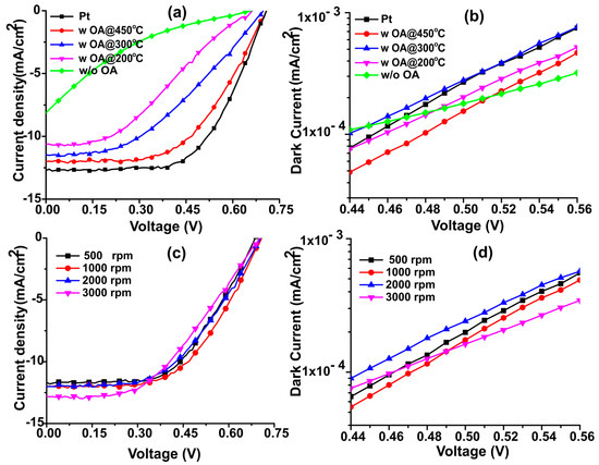 Photocurrent density-voltage (J-V) curves of solar cell devices fabricated using platinum and N-dC counter electrodes (a) annealed at different temperatures, and (c) coated at various spin speeds, (b,d) dark current plots of respective photovoltaic devices. All the J-V curves were measured on cell areas of 0.25 cm2 under 1 sun illumination.