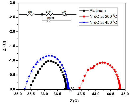Nyquist plot of symmetrical cells with two identical electrodes of conventional platinum, and N-dC aerogel, annealed at 200 and 450 °C, working as counter electrode. The plots were taken in the frequency range of 0.01 Hz to 1 MHz with 10 mV amplitude in the dark. All devices were biased at Voc. The inset of the figure shows the equivalent circuit diagram of the symmetrical cells used to fit the impedance data; Rs: series or internal resistance, Rct: charge transfer resistance, Zw: Diffusion Impedance, CPE: constant phase element.